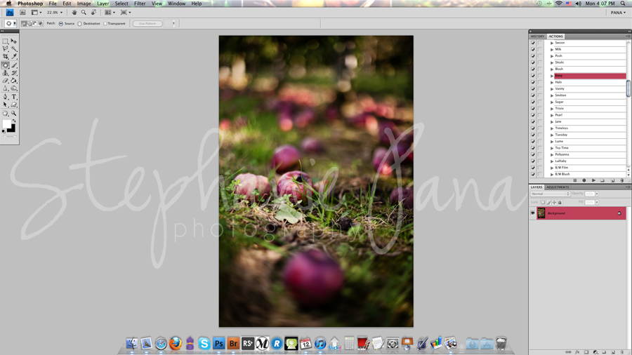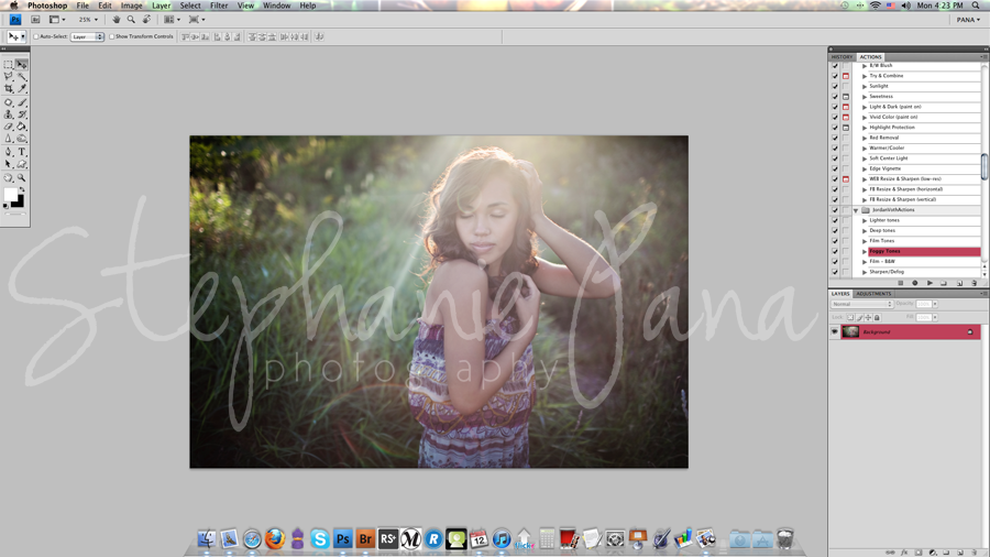 Lastly, I used Jordan Voth's "Foggy Tones" action to create my haze over effect. At that time, I still felt the image wasn't as "warm" as I'd like it to be, so I added an additional "warmer" layer from Florabella's Action set to polish it off.