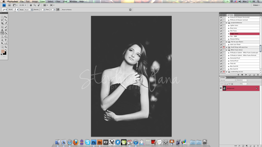 Once the image has entered Photoshop, I work first and foremost on the skin. Once that is completed, I de-saturated the image and then move onto using Jordan Voth's "Lighter Tones" action to add a nice amount of contrast to the image that I needed (as seen above).