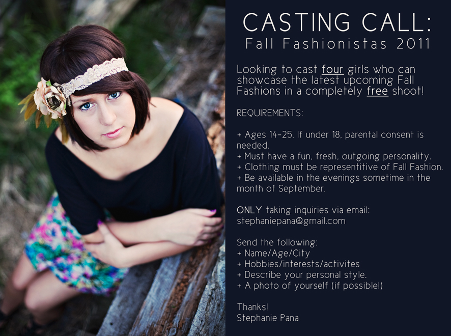 Last year I did my first big casting for something I called my "Fall Fashionistas"! The turn out was incredible and I had a blast getting to work and meet so many new faces. I've decided to do it again this year in hopes of meeting even more fabulous new faces! I know it's crazy to think about the Fall already but things have gotten so busy here lately that I want to make sure I can squeeze this in before it really IS fall.